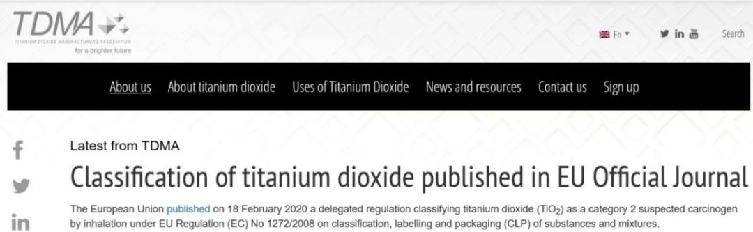 2020年2月18日,歐盟發(fā)布了一項官方授權(quán)法規(guī),根據(jù)關(guān)于物質(zhì)和混合物的分類,標(biāo)簽和包裝(CLP)的歐盟法規(guī)(EC)第1272/2008號,通過吸入將二氧化鈦歸為2類疑似致癌物。新的法規(guī)將于2021年9月生效,歐洲涂料行業(yè)對此決定提出了抗議。